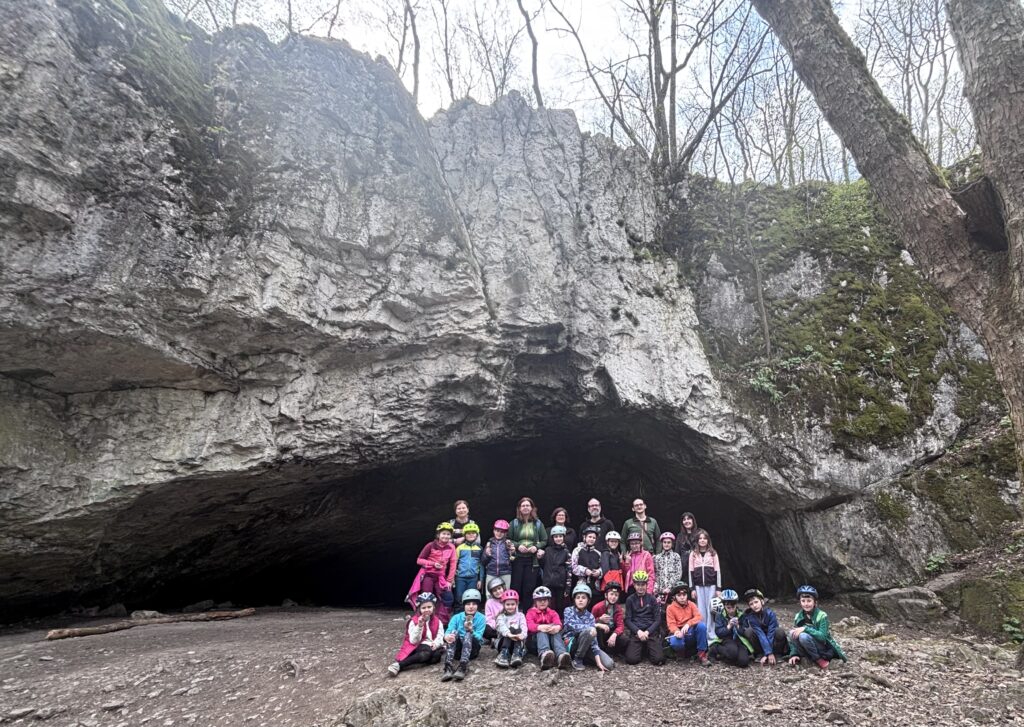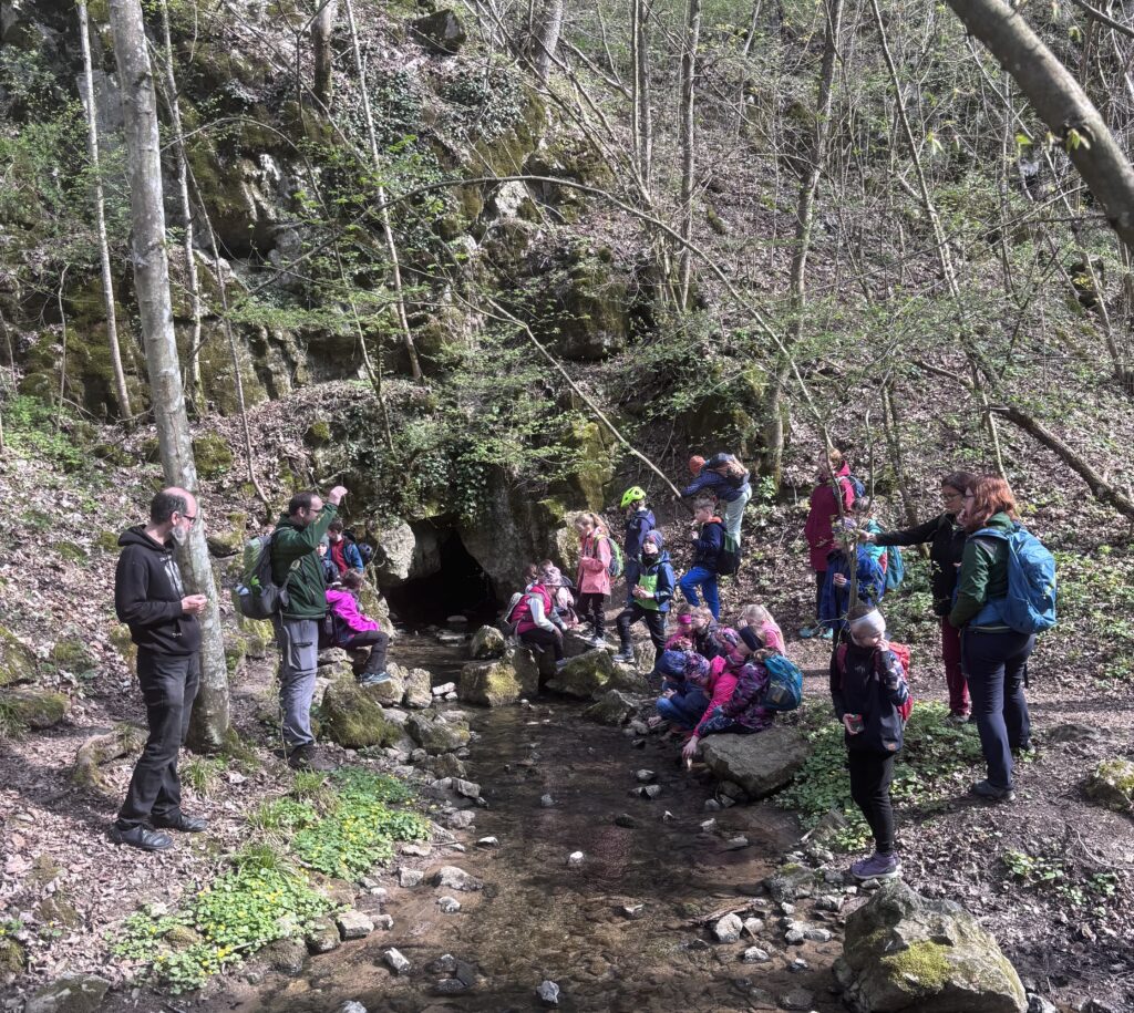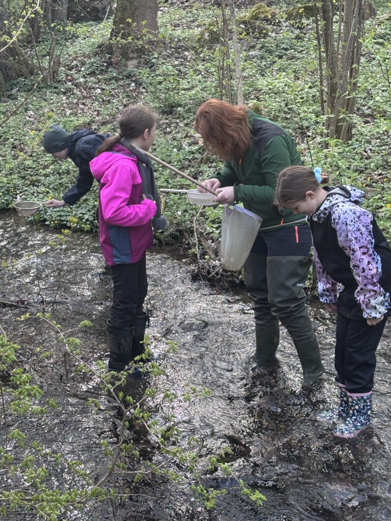 U Říčky bylo krátké hydrobiologické zastavení, představili jsme si zvířata, která se zde vyskytují. Pak si děti taky zkusily něco nalovit. Dostaly na zapůjčení i biokuky (kelímek s lupou na pozorování bioty pod zvětšením) a na chvíli se staly biology. Poté jsme se vydali botanickým tempem proti proudu, kde jsme viděli zajímavé hydrologické jevy – vývěry Říčky. Na závěr jsme dorazili k jeskyni Pekárna – významné archeologické naleziště, do které jsme se i podívali.
